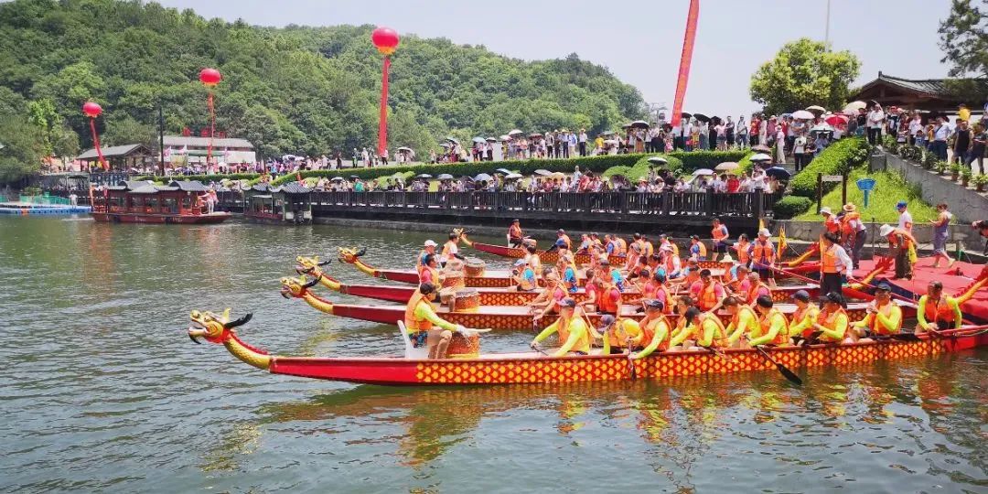 武汉黄陂木兰天池景区端午节期间举行2023木兰天池中华龙舟节,白天游客可在锣鼓喧天中看船桨一起一落激起串串水花,在设置的古风市集,游客可到现场体验包粽子、佩香囊、射五毒、画面人等活动。