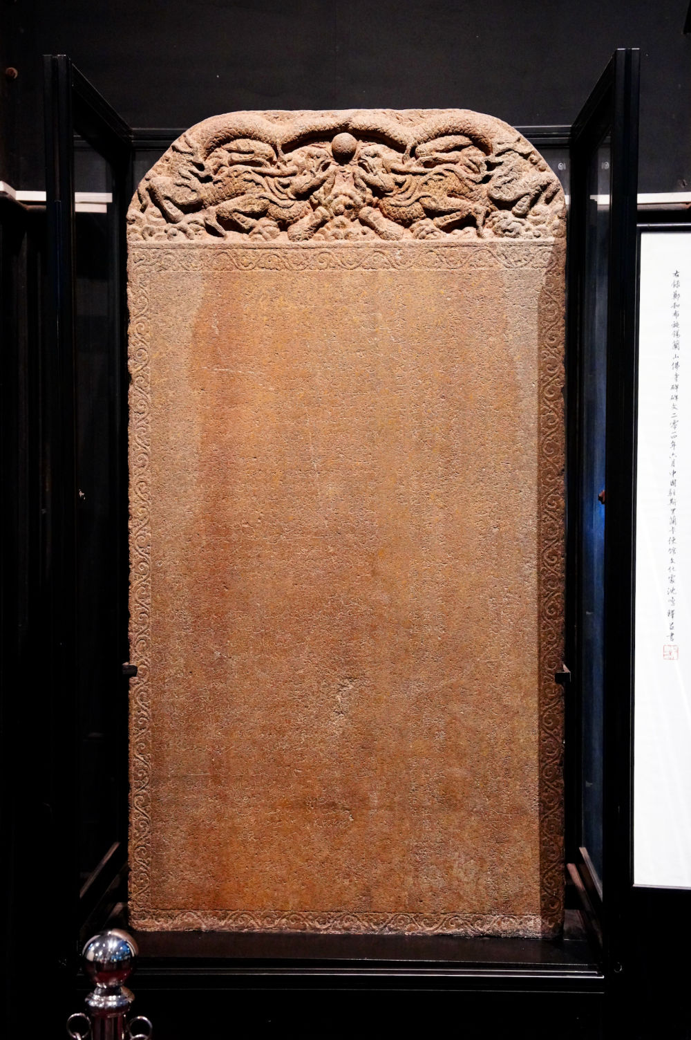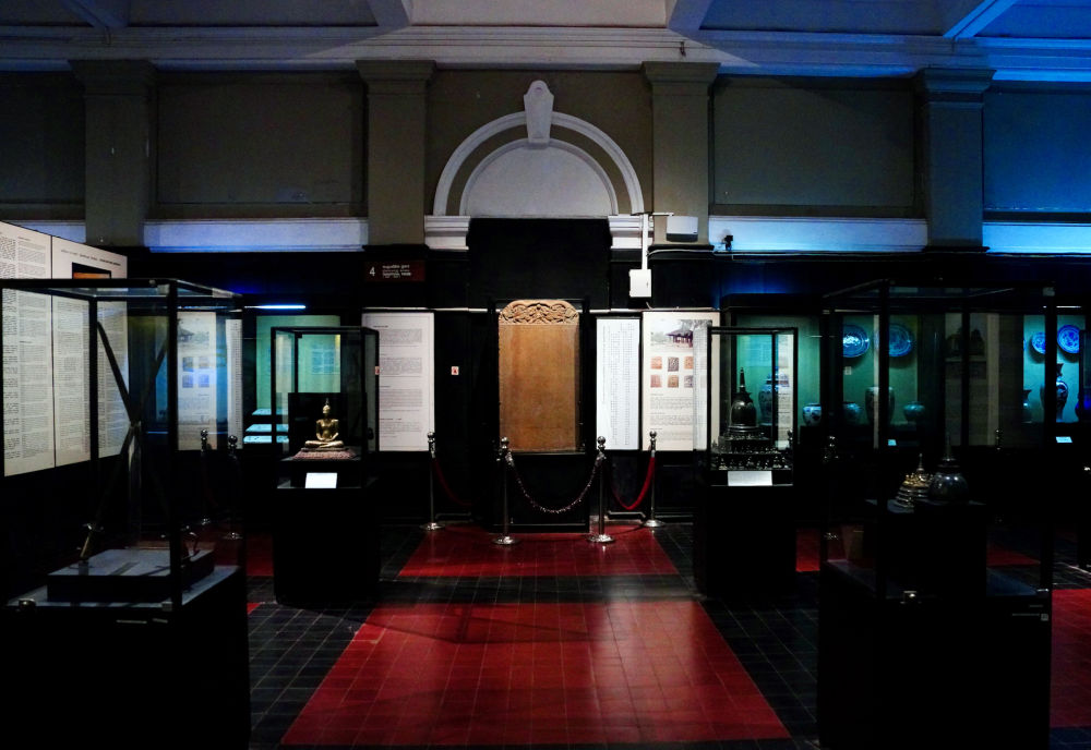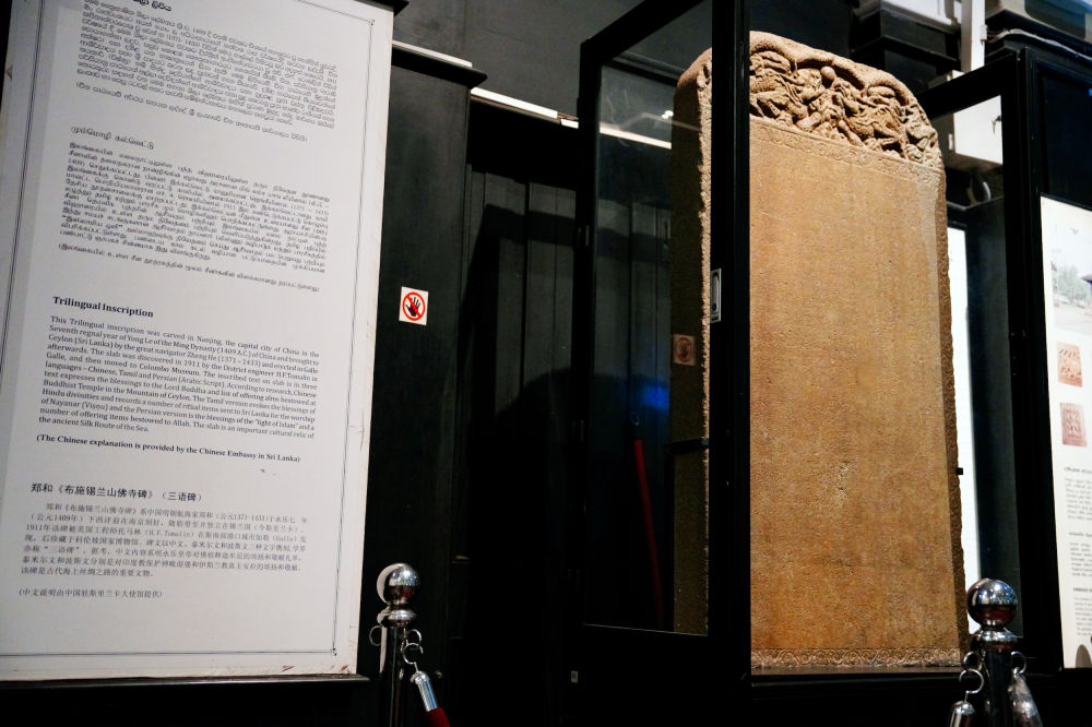 ↑4月17日,郑和遗存《布施锡兰山佛寺碑》(中)在斯里兰卡科伦坡国家博物馆主展厅展出。新华社记者 伍岳 摄