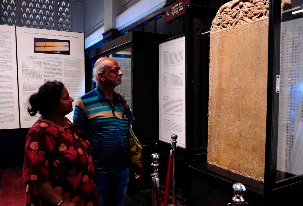 ↑4月17日,在斯里兰卡科伦坡国家博物馆,观众参观郑和遗存《布施锡兰山佛寺碑》。新华社记者 伍岳 摄