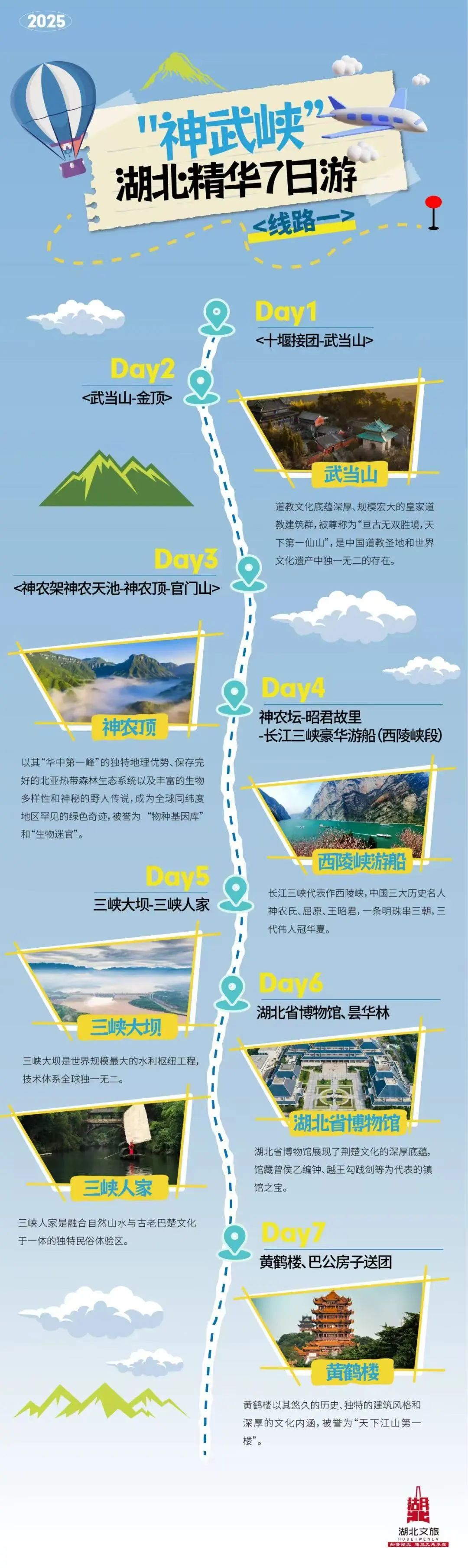 湖北,揽山水之美,得人文之胜。坐拥原始秘境神农架、仙风道骨的武当山、雄奇瑰丽的长江三峡等顶级自然资源,是五洲四海游客向往的旅游目的地。