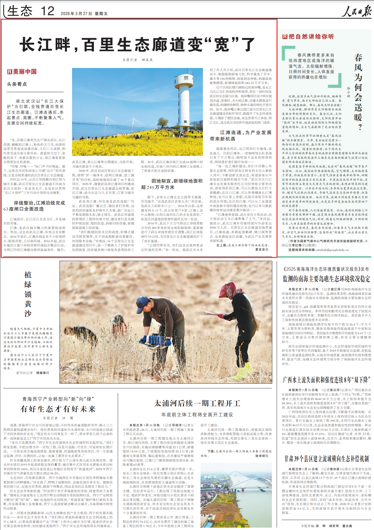 湖北武汉以“长江大保护”为引领,全线贯通百里长江生态廊道。江滩连通后,串起景点、商圈,不断聚集人气,发展空间持续拓宽。