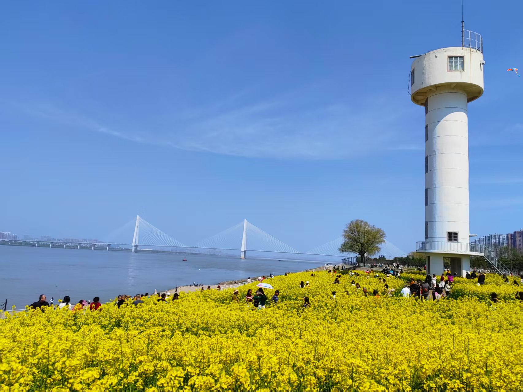 (武昌江滩白塔下的油菜花海,夏言言摄)