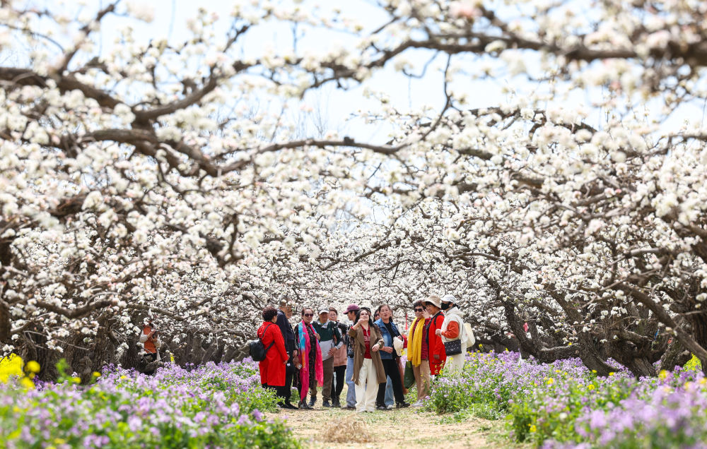 2025年4月5日,游客在河北省晋州市周家庄乡第九生产队梨园内踏青赏花。新华社发(梁子栋 摄)