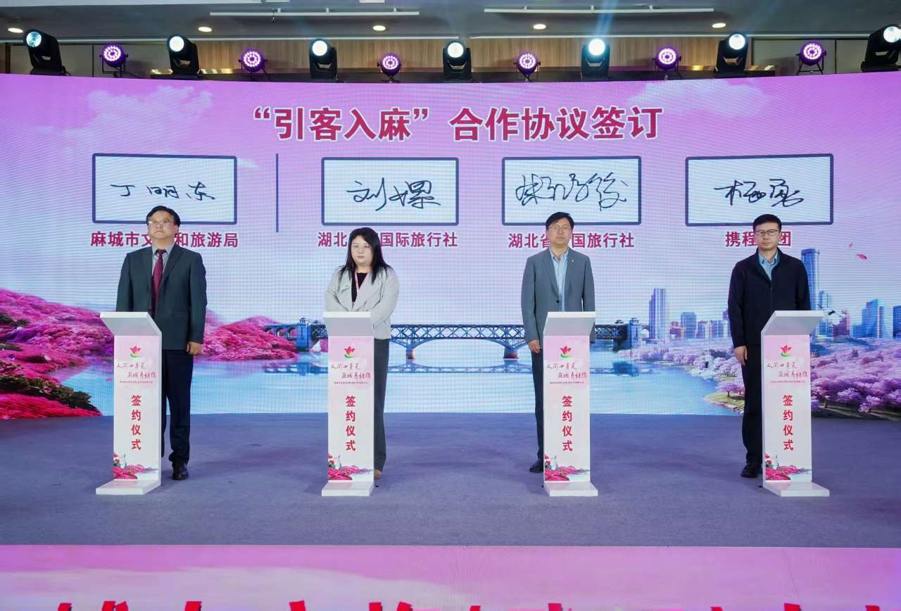 推介会现场,麻城市文化和旅游局与湖北康辉国际旅游社有限责任公司、湖北省中国旅行社有限责任公司、携程旅行代表签订“引客入麻”协议。