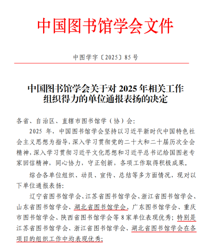 湖北省图书馆学会2025年工作获中国图书馆学会通报特别表扬