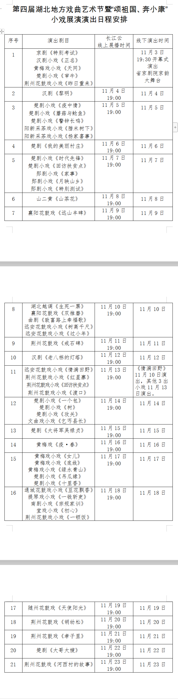 值得一提的是,此次展演活动将采取线上线下相结合,云上观剧与现场惠民演出同时进行。开幕式演出结束后,其他参演剧目将于11月4日至23日进行云上展播,并在17个市州开展惠民演出和进景区演出活动。