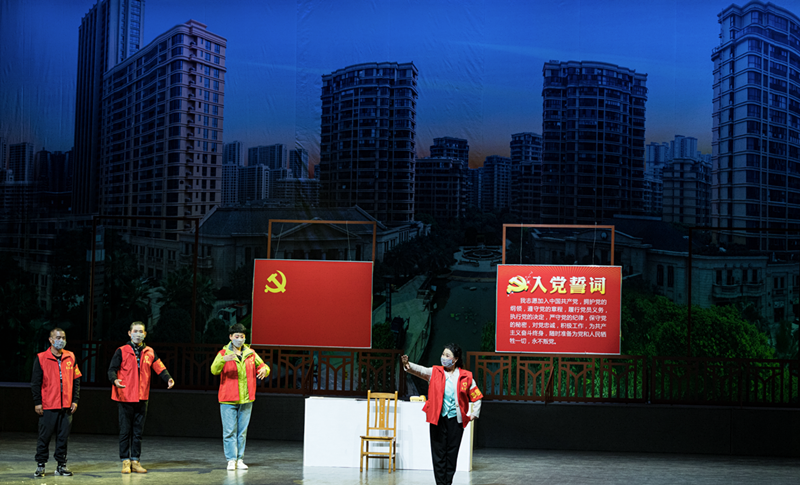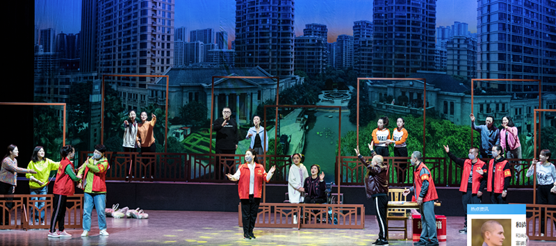 汉剧《老八栋的灯塔》取材自荆州区抗疫英雄董李会和安心桥社区书记吴代红的亲身经历,讲述原本在老家过年的社区女书记,为守住社区疫情防控的第一道防线,一天一夜徒步回到居委会,点亮老八栋小区象征干事创业精神的灯塔来激励居民团结一心、共同抗疫的感人故事。该剧用纪实手法真实地再现了社区一线的抗“疫”故事,展现了一幅凝心聚力、众志成城的友爱画卷,人物形象鲜活,赢得现场观众的交口称赞。胜利街道办事处副主任徐喜元看完演出后表示,作为一名社区工作者,亲身参与了疫情防控工作,演出让她深受感动,希望这样的优秀剧目能够多进社区、学校,让大家透过这些动人故事,感受到众志成城的伟大抗疫精神,凝聚正能量。