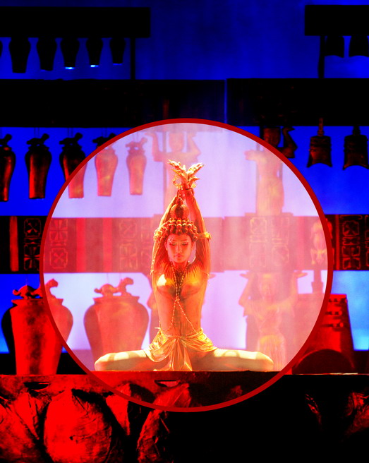神农木鼓,粗旷豪放;沮漳陶影,悠远妩媚;利牙·火塘,神圣温馨;巴山夜话,浪漫神秘;千秋简魂,厚重深邃;香溪桃花,美妙亮丽;兵书宝剑,雄浑威武;瑶瑟祥舞,恢弘华彩。巴与楚的融合,“虎”与“凤”的交融,大地震撼,辉煌灿烂。