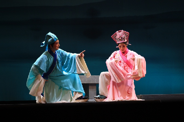 从山沟里走出来的梁山伯淳朴忠诚,他与聪慧开朗的民间女子祝英台,共同演绎了一出堪称千古绝唱的爱情悲剧:祝英台在学馆向梁山伯立下了条条严规,既护住了男扮女之身,又试出了山伯的人品。友情在山伯心中增长,爱情在英台心头缠绕。她以心中掏不尽的情丝偷偷绣了一件爱情信物—一绣蝶红鞋,在河湾担水时托付给师母。当山伯得知真情,深深友情化为火辣爱情,哪里经得住惊闻婚变?他愤而“闯帘”,吐血病倒、英台以独特的“描药方”表达了殉情决心。在送葬与迎亲的人流交汇时,她奔出花桥,带着新娘的柔情,叩开墓门而“圆婚”了。他们爱情被埋葬了,但又新生了,呼唤出人间一片春色。