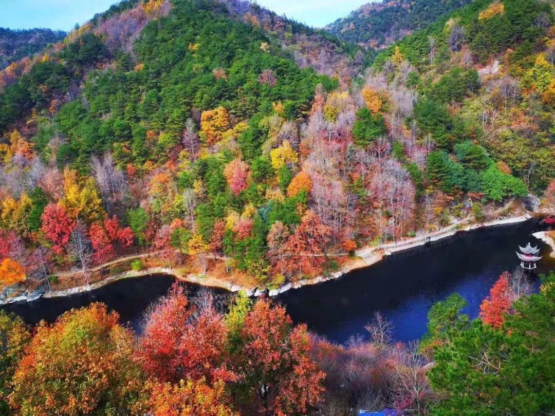 秋季层林尽染,万山红遍。景区万亩森林中,青枫、红枫、乌桕树和槭科类秋季红叶树种达5000余亩。