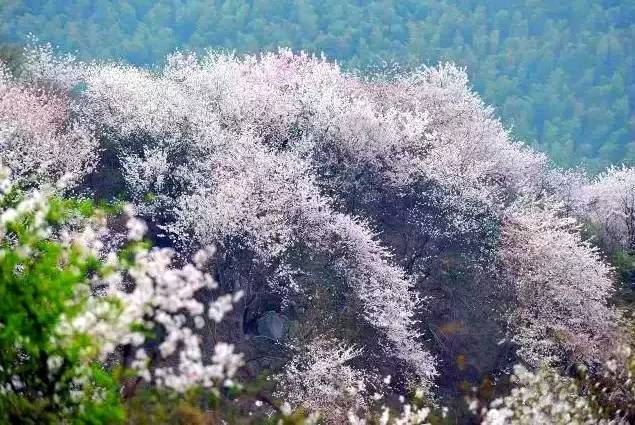 清凉寨中华樱花面积达3200余亩、11万余株, 6个以上品种,分早中晚三期次第开放,花期从三月初持续到四月底。