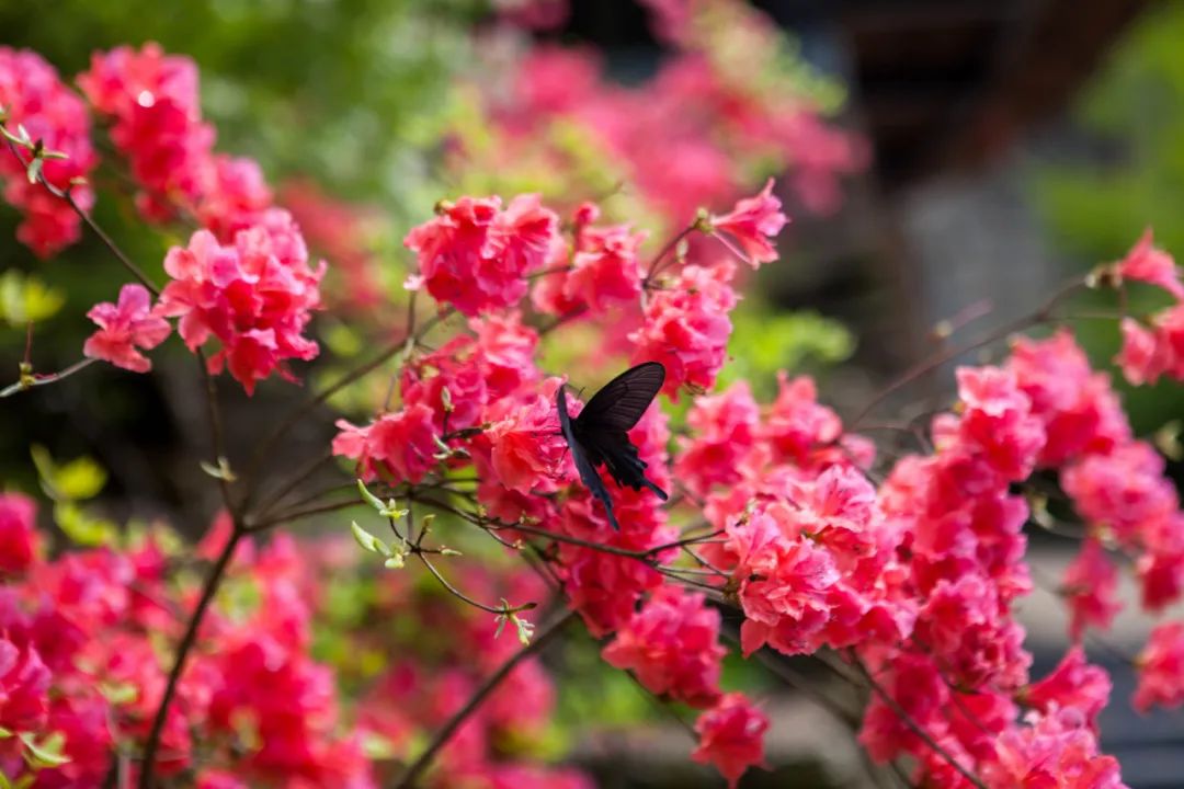 再往上走,晚樱的身影逐渐被野生杜鹃的艳丽所代替,此处不闻人声,只闻鸟啼,清幽静谧。