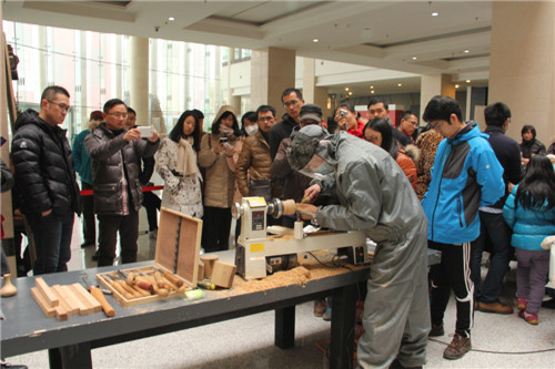 2、现场木旋制作演示,由术木特聘木旋老师现场讲解木工车床和木旋制作示范;