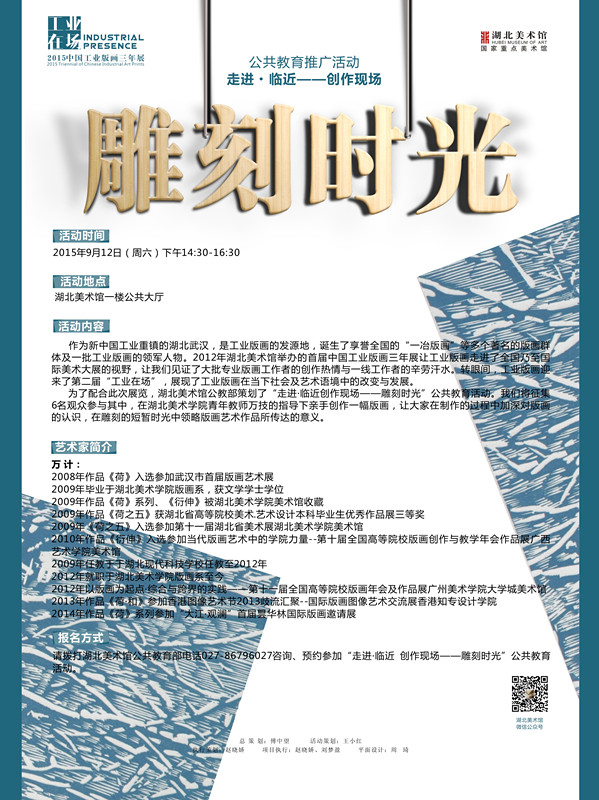 为了配合此次展览,湖北美术馆公教部策划了“走进•临近创作现场——雕刻时光”公共教育活动。我们将征集6名观众参与其中,在湖北美术学院青年教师万技的指导下亲手创作一幅版画,让大家在制作的过程中加深对版画的认识,在雕刻的短暂时光中领略版画艺术作品所传达的意义。