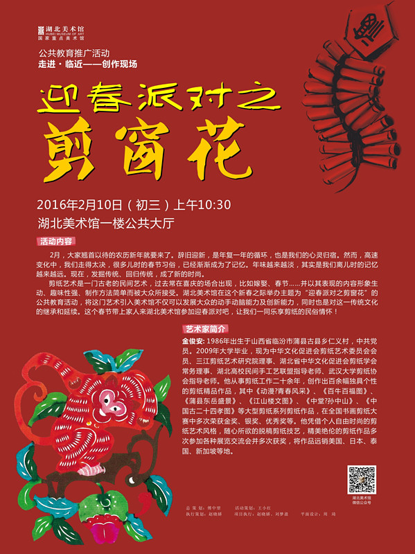 剪纸艺术是一门古老的民间艺术,过去常在喜庆的场合出现,比如嫁娶、春节……并以其表现的内容形象生动、趣味性强、制作方法简单而被大众所接受。湖北美术馆在这个新春之际举办主题为“迎春派对之剪窗花”的公共教育活动,将这门艺术引入美术馆不仅可以发展大众的动手动脑能力及创新能力,同时也是对这一传统文化的继承和延续。这个春节带上家人来湖北美术馆参加迎春派对吧,让我们一同乐享剪纸的民俗情怀!