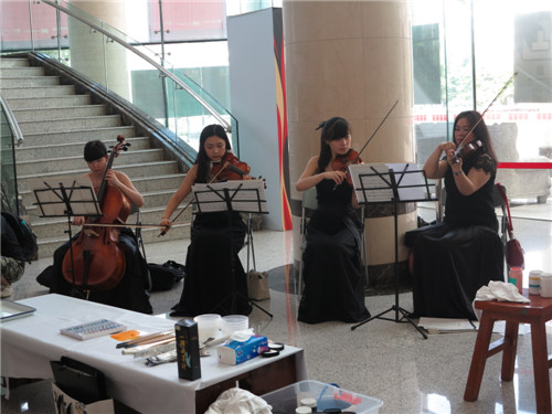 在弦乐四重奏舒缓的《小夜曲》中“重奏·七拍”拉开了序幕,四位艺术家都在各自准备着颜料与工具,而观众们在等待的同时静静地欣赏着大屏幕上关于艺术家的介绍与作品。
