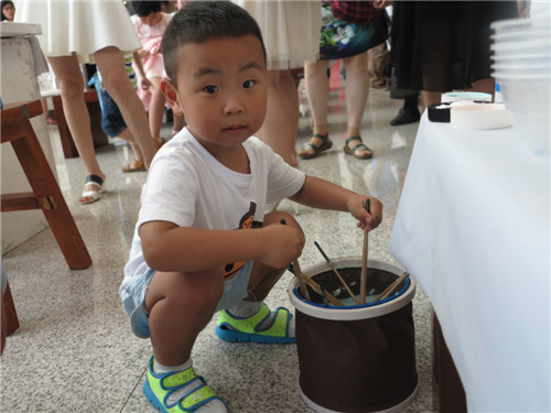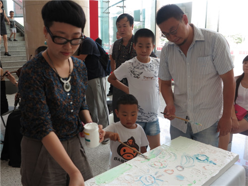这个小男孩是现场年龄最小的一位观众,腼腆的他在爸爸的鼓励下拿起了画笔,在画完后露出了羞涩的笑容。