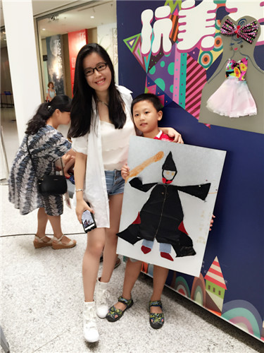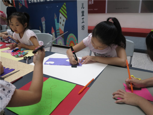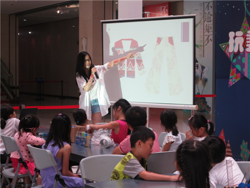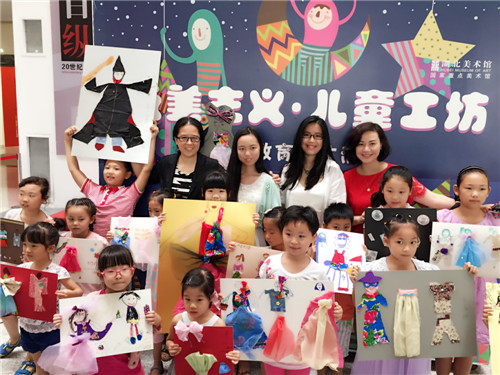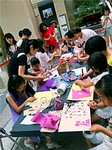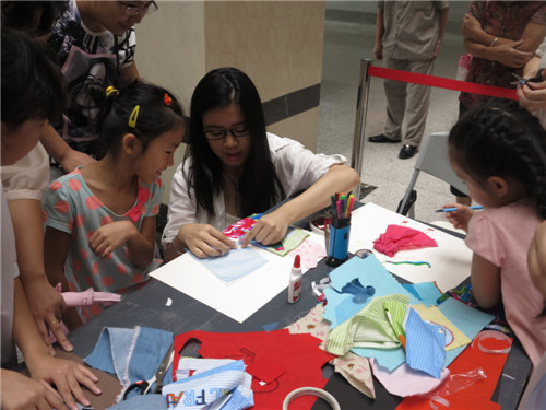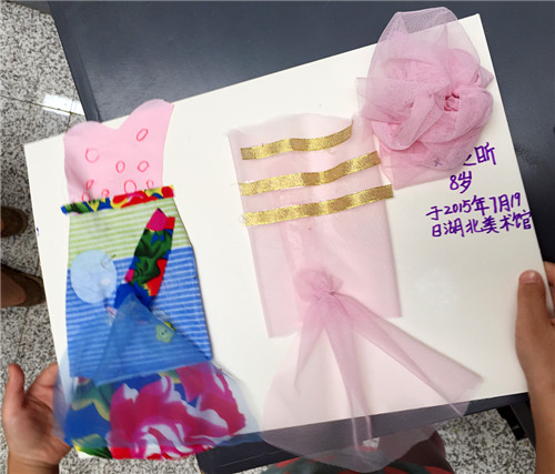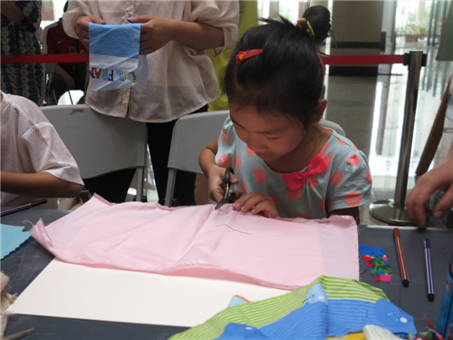 正逢“再七拍——武汉当代女艺术家作品展”在我馆展出,本期“玩美主义·儿童工坊”特别邀请到参展艺术家余萍和她的女儿陈太阳带领孩子们用各种颜色及质地的废旧布料剪出不同的形状拼贴在一起,将小蝴蝶结、纽扣等多种材料进行创意搭配,自主设计服装,玩转纸板上的服装秀。