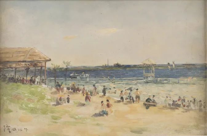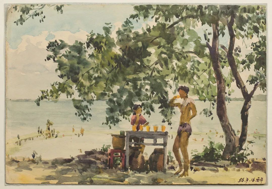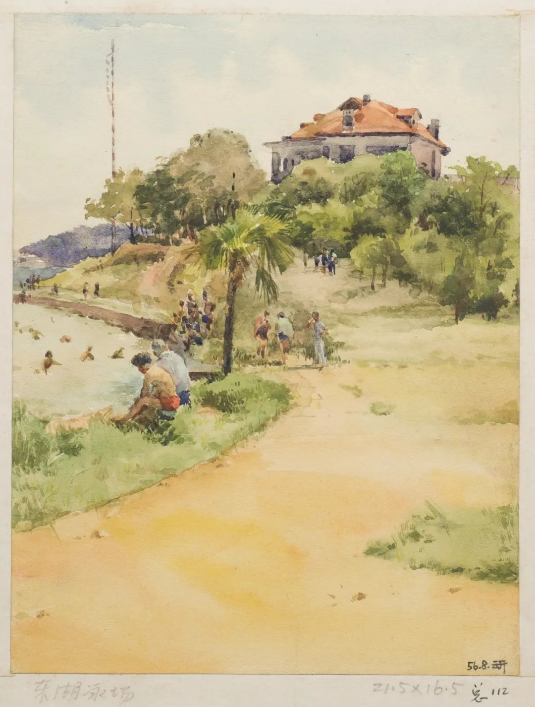 严云开的《东湖泳场》系列水彩作品还原了武汉人在炎炎夏日到东湖游泳消暑这一老武汉的传统活动场景。在他的画作中,东湖的湖水并不会占据很大的画面,因此我们能够欣赏到的并不是宽广的湖面,而更多的是岸上的风景与人。