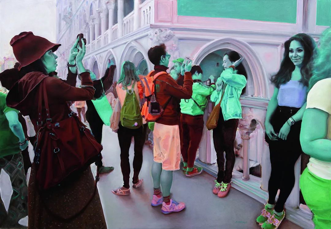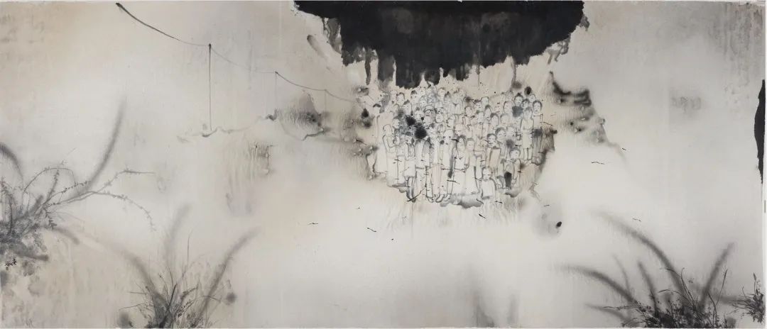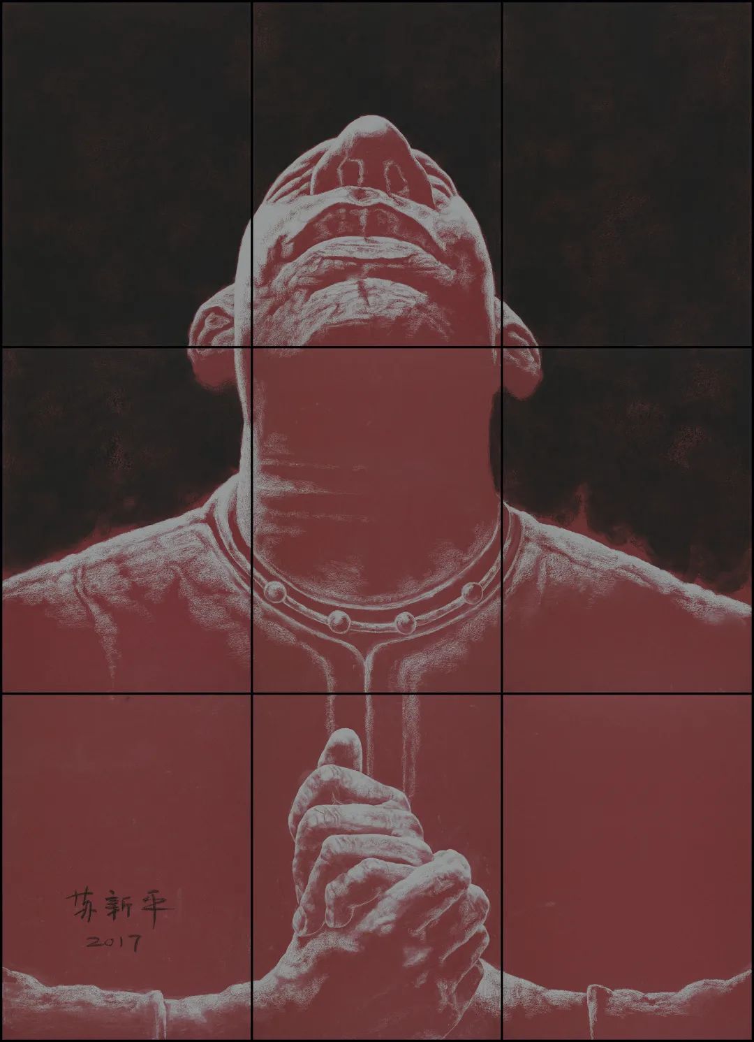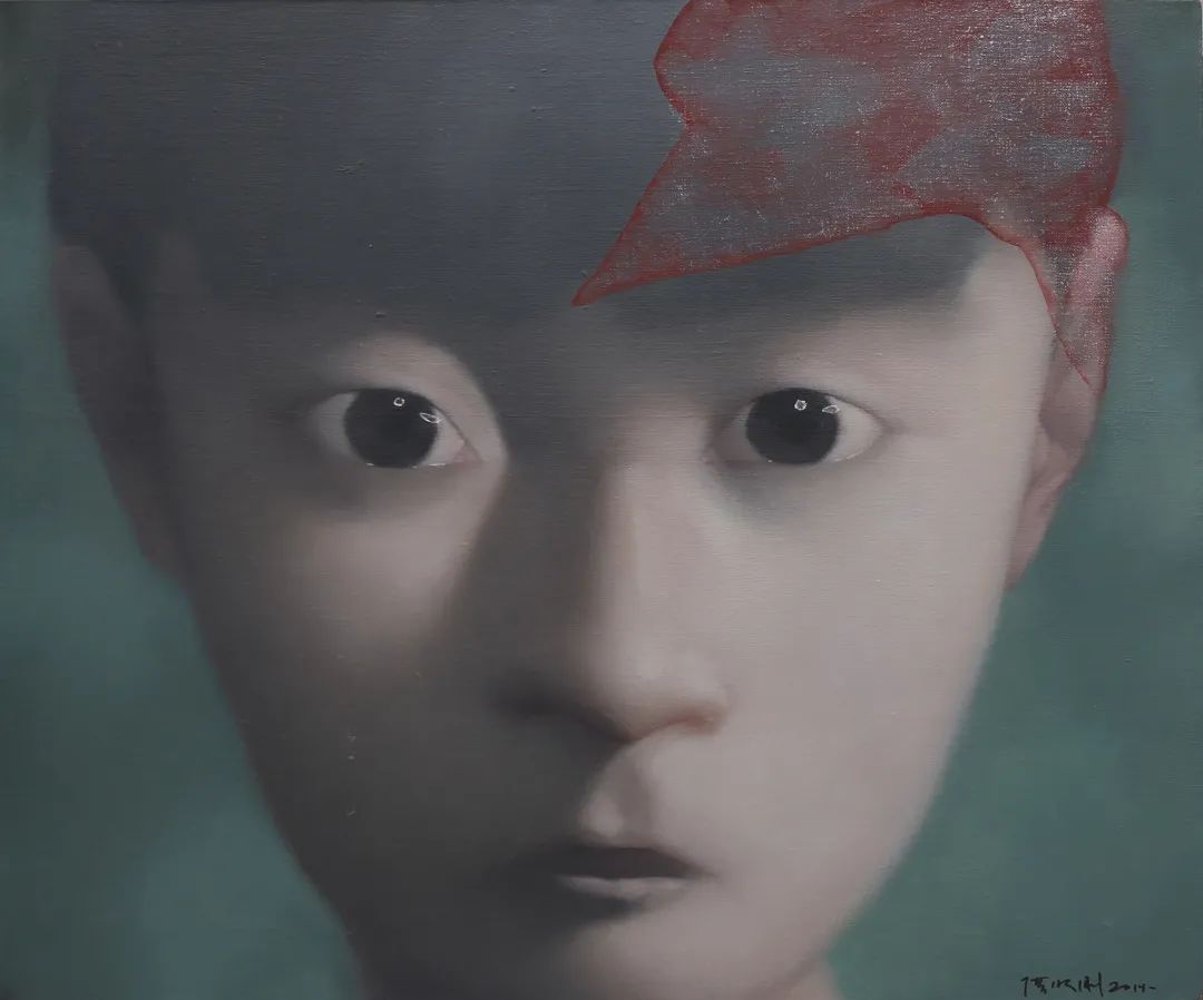 合美术馆收藏的《面孔2019》是《血缘——大家庭》系列的延续。如他以往的相关作品一样,不是画的合影,而是画的独照。画面的形象直接采用了老照片或是证件照的形式,并剔除了一切具体的背景,就如同一张特定的时间切片。在艺术表现上,艺术家用一贯的不饱和色彩去呼应人们对往昔“陈旧”时光的视觉记忆,用呆滞或千篇一律的面容让观众认识过去人们的普遍精神状态。此外,艺术家还用不期而至的红色光斑来打破由观众与画中人物的凝视所带来的过多的感性因素,突出了一种陌生化的距离感。