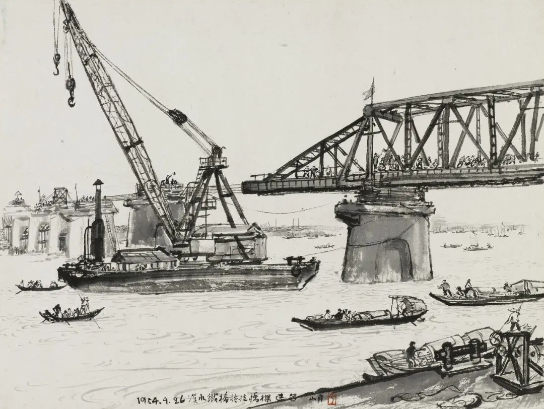 ▲关山月 《汉水大桥在建设中》 32.5cm×43.5cm