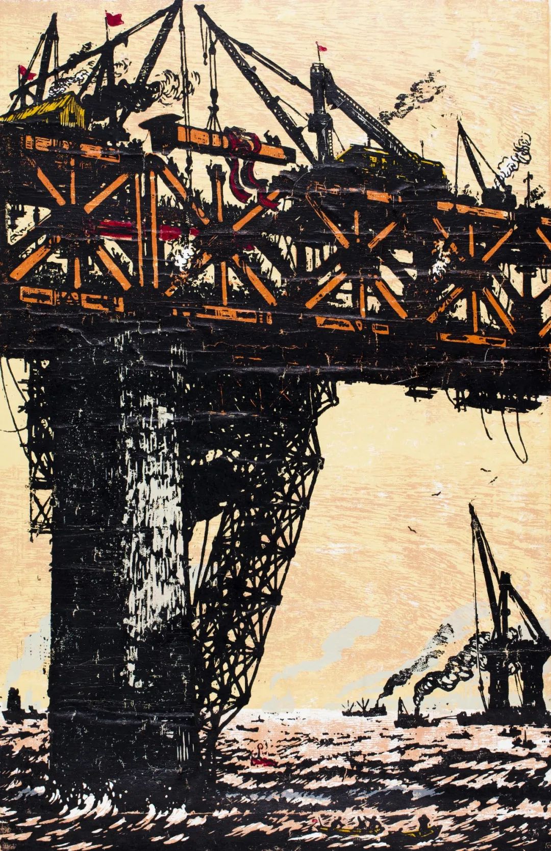 “战士画家”武石在1957年创作的套色木刻版画《最后一根钢梁》,因其“气魄大而有感染力”引起强烈反响。