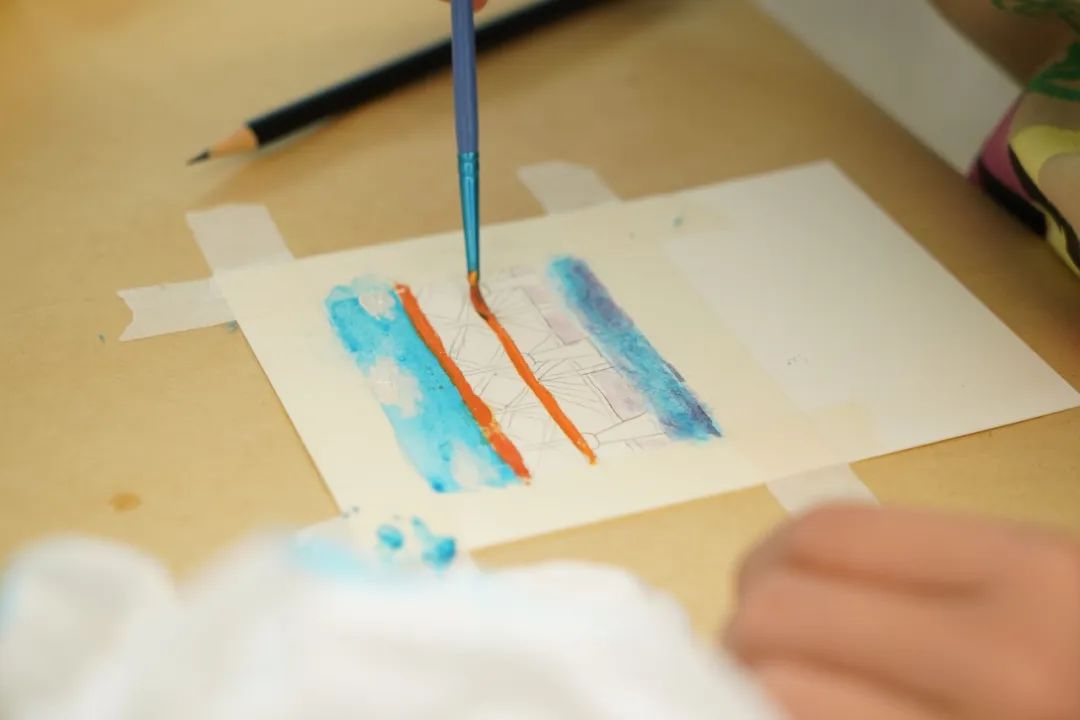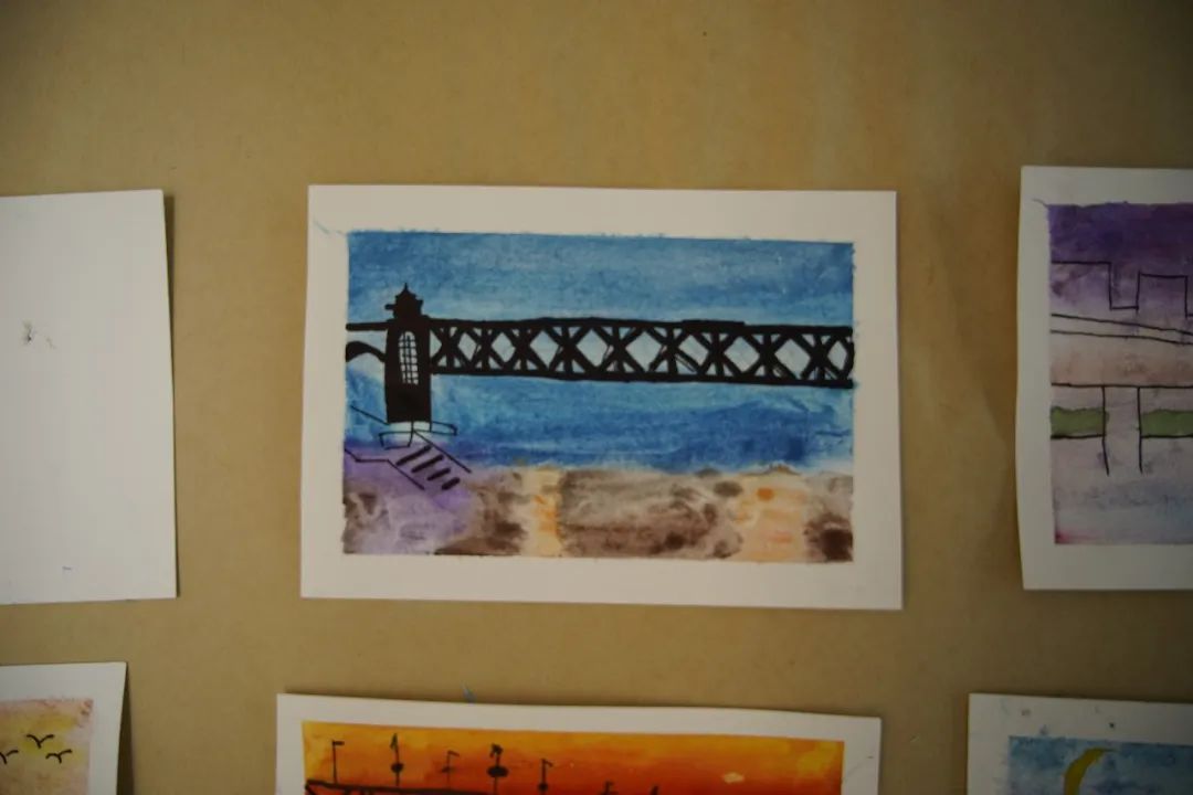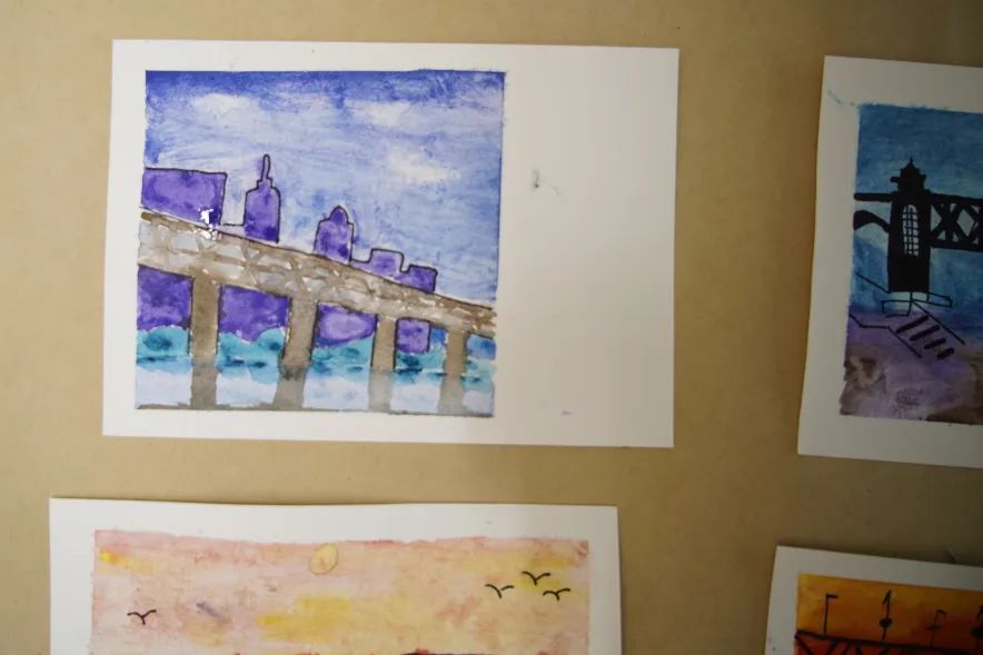 ▲小朋友们开始在水彩明信片上描绘长江大桥
