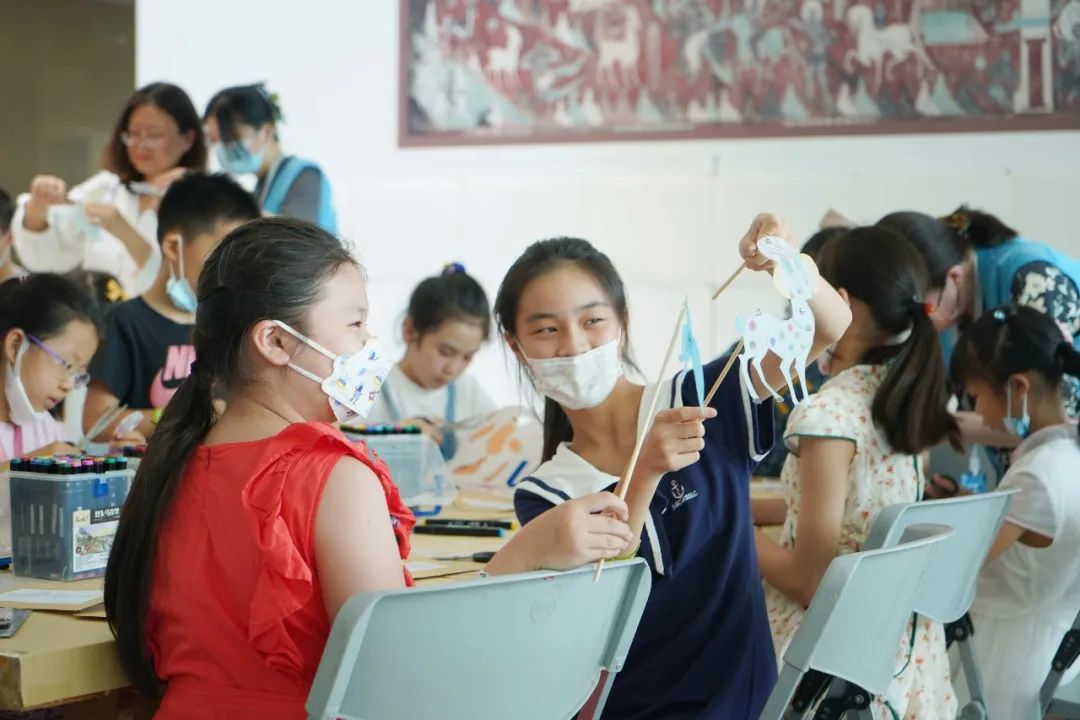 ▲小朋友开心地拿起自己创作好的皮影展示