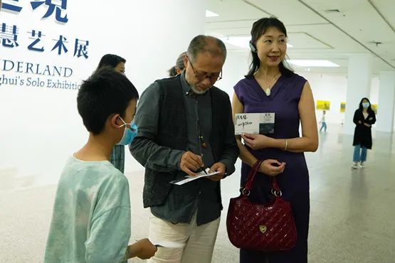 ▲在美术馆准备的互动卡上,张广慧为观众签名留念