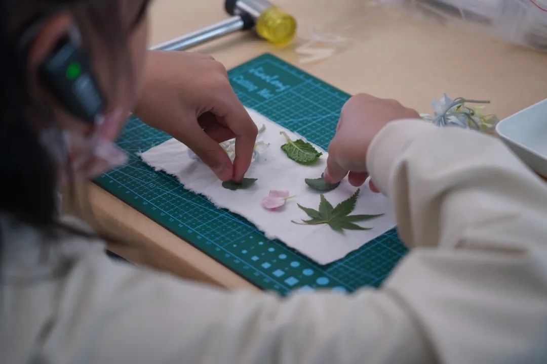张广慧满面笑容地回答道:“嗯,形式有些像,但也不一样,你们一会要做的是将新鲜树叶印到布上,我的这个是将干树叶放到打碎的纸浆中晾干。我们都是利用自然的东西去直观呈现,这也是我对艺术形式不同可能性的探索。”