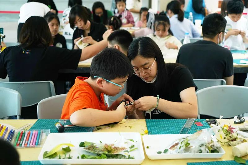 通过艺术家的讲解,小朋友们已经了解到以画面表达心境的创作方式,于是各自在材料盒中选择了自己喜欢的植物,自如地在画布上摆弄起来。达到满意的效果后,小朋友们在爸爸妈妈的协助下将植物固定,开始拓印。