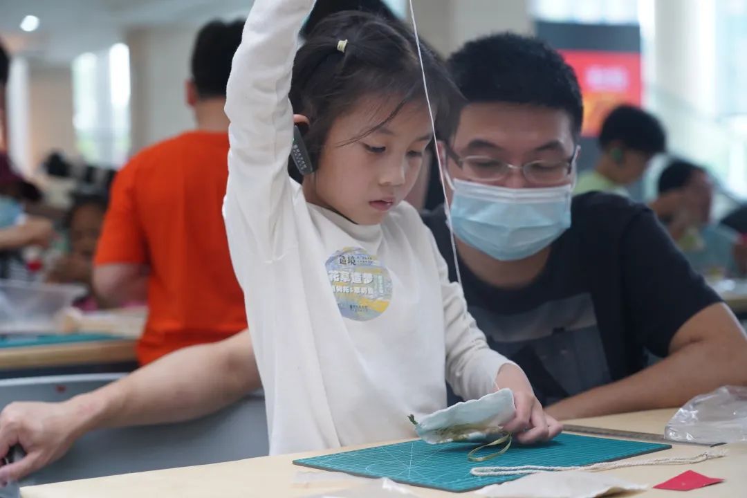 于是,在家长和工作人员的协助下,大家将拓印好的布面缝制成香囊状,有些动手能力较强的小朋友,更是全程自己动手完成。