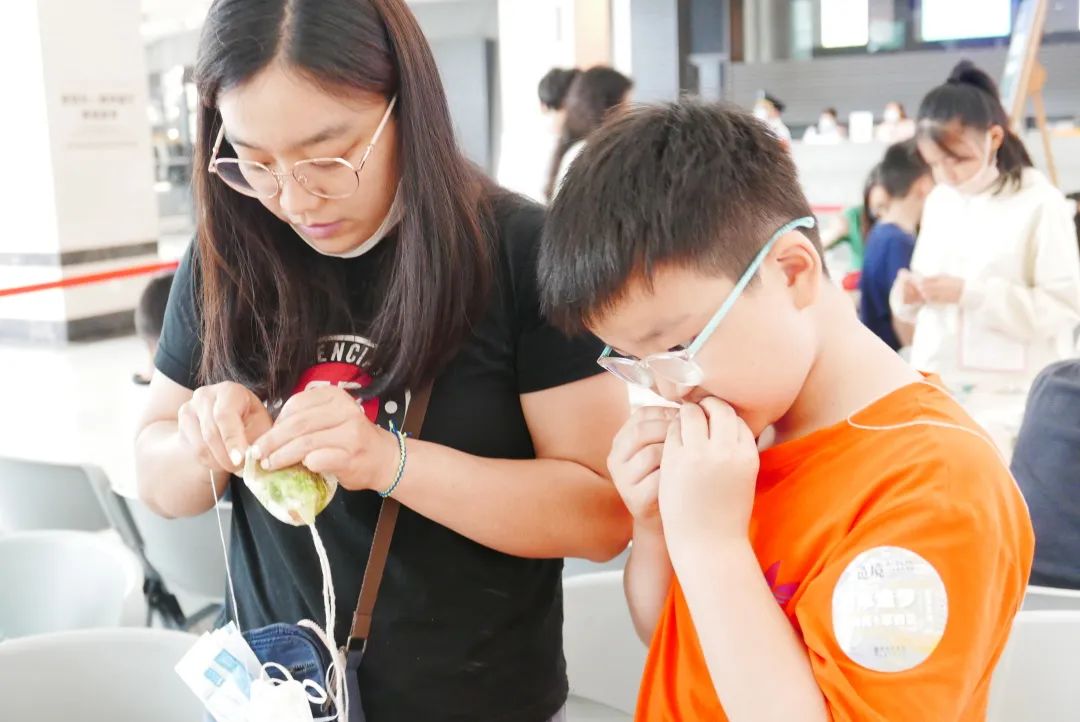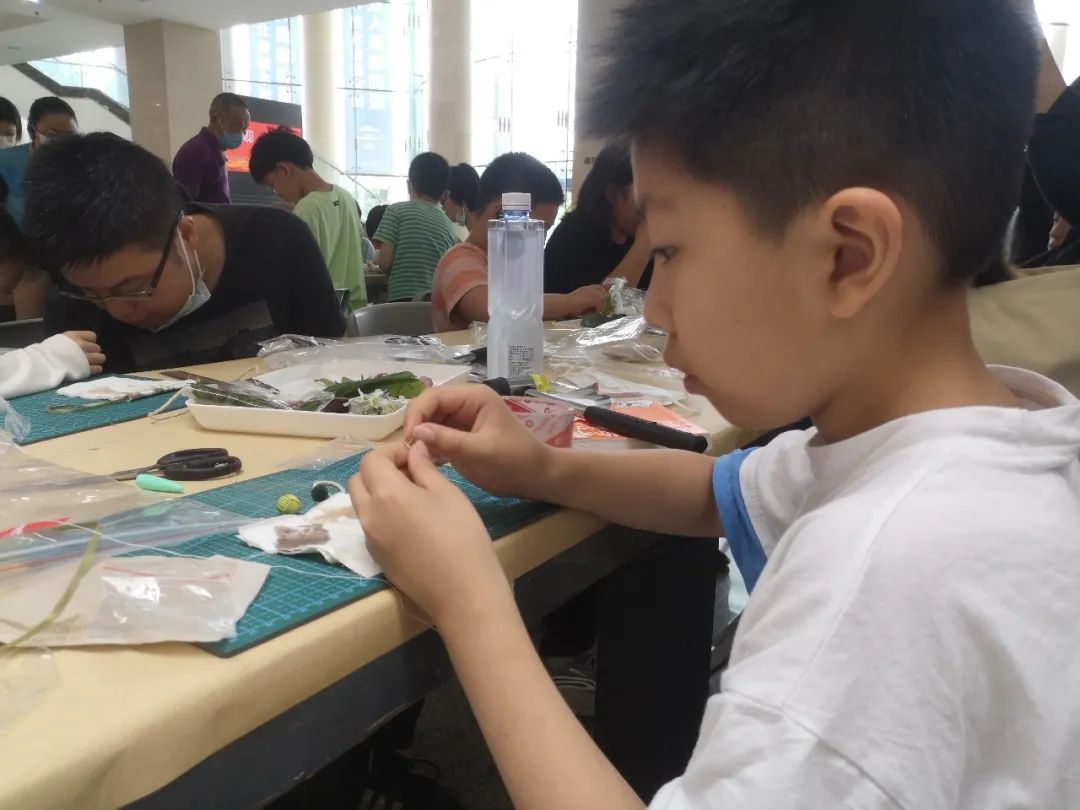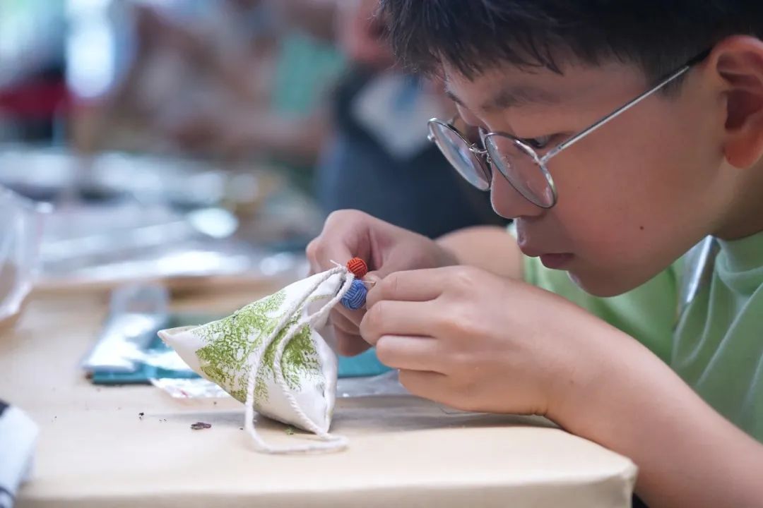 塞入草药包并封口后,粽子形的香囊便已初步完成,为了让它看起来更加美观,大家利用美术馆提供的材料包内的装饰品为各自的香囊进行了装饰点缀,这下更加精美了,小朋友个个爱不释手,甚至抛向空中以庆祝自己鬼斧神工的作品完成。