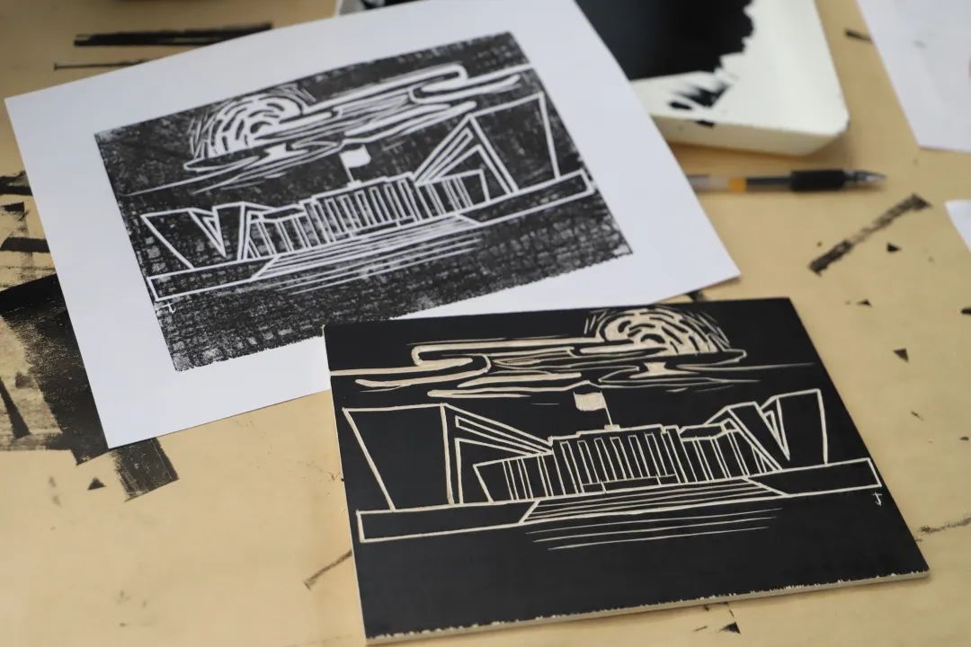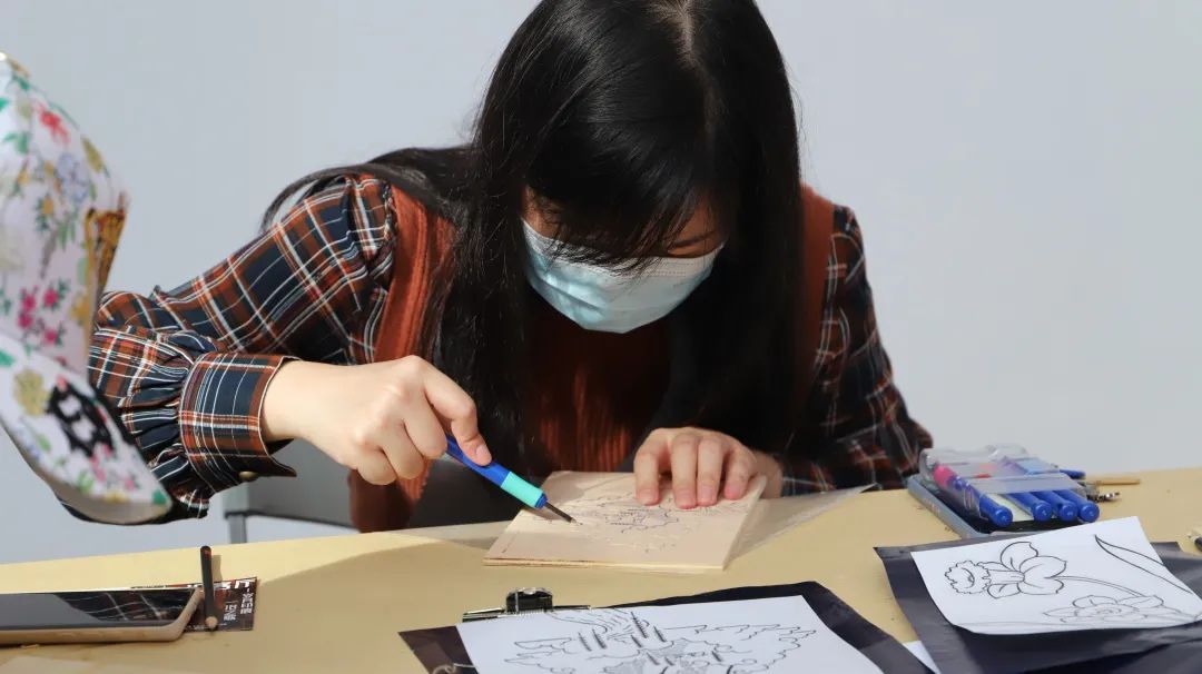 刻刀、铅笔、木板、围裙,桌上精心摆放的工具和志愿者清晰明了的讲解吸引着大家摩拳擦掌、跃跃欲试。有的对照画稿精心勾描,有的摆弄刻刀仔细揣摩,还有的三下五除二刻完版面开始挽起袖子拓印,整个手工坊到处燃烧着如火如荼的创作热情。不多时,含苞待放的迎春花、抽象面孔的小女孩、线条繁复的琴台大剧院……精彩“大作”纷纷出炉,引来叫好声一片。