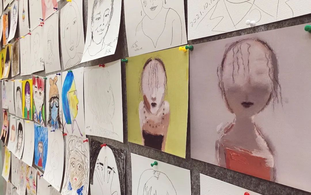 展览开幕当天,“@武汉·2021 面孔”也如火如荼的展开着,陈淑霞率先画好一幅自画像粘贴到了活动的展示墙上,观众在陈老师的带领下纷纷拿起画笔开始了创作,转眼间墙上被大家的作品贴的满满当当,一幅幅栩栩如生的面孔在美术馆相遇呈现。