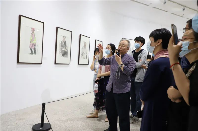 来到人物画作前,接下来为大家导览的便是以人物画创作见长的李乃蔚。为达到雅俗共赏的目的,他此次的表现形式选择了小写意的人物厅堂画,展现了神农架地区少数民族的民风民俗。而植物色层层渲染的技法,则使得画面始终保持透亮,令在场观众啧啧称赞。