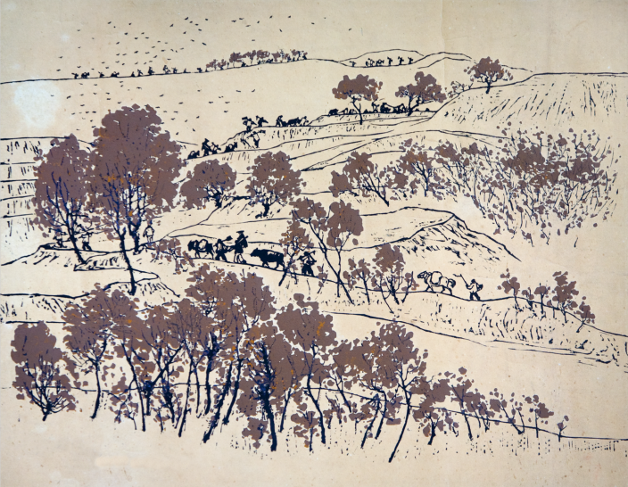 进入新中国时期,党和国家的方针政策成为艺术创作的风向标,特别是“文艺为工农兵服务、为无产阶级政治服务”方针的确定后,各类美术活动和美术创作均紧密围绕当时社会的思想和政治运动繁荣展开,涌现出大批极具时代特色的艺术作品,如湖北美术馆馆藏作品《山地冬播》等。该作品作为版画家陈天然的代表作,画面简洁朴实而又遒劲有力,蕴藏着浓郁的乡情,陈天然也以其版画上的卓越成就被调任湖北艺术学院版画教研组组长,成为湖北现代版画教育的开拓者之一。