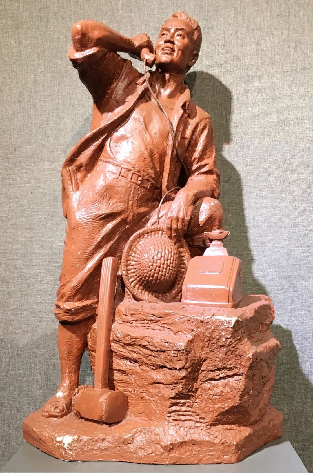 在湖北美术馆三楼的展厅中,就有这样一件诞生于当年黄陂泥塑训练班中的代表作品——《书记的办公桌》。作者项金国于1950年出生于湖北省黄陂县,从小热爱绘画的他在听闻黄陂农民泥塑的消息后第一时间前去参加,从此开始了他的艺术生涯。这件创作于1976年的泥塑作品,虽未直接表现农民的劳动场景,却从侧面反映出当时农村地区群众热火朝天的劳动生活。作品中的人物——书记敞开衣襟,高卷裤腿,活力充沛且干劲十足。书记右手拿起电话话筒置于耳边,仰首欢笑,如沐春风,似乎正在兴奋地向上级汇报此时的丰收成果。