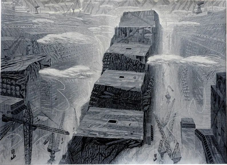 1999年“第九届全国美术作品展览”中的金奖作品《世纪三峡》中,为表现国家重大工程建设题材,作者王晓愚走进三峡工地采风创作,用纪念碑的意象形成构图,对崖壁、塔吊等细微刻画,使画面的气势与细节得到完美统一。