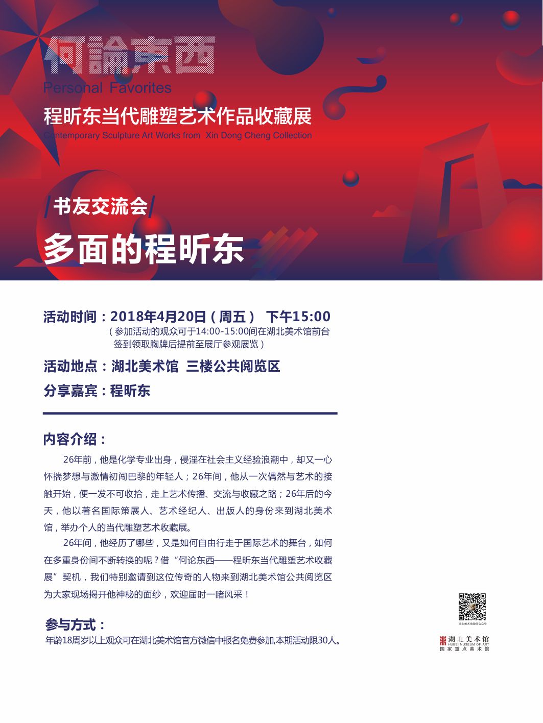 26年间,他经历了哪些,又是如何自由行走于国际艺术的舞台,如何在多重身份间不断转换的呢?借“何论东西——程昕东当代雕塑艺术收藏展”契机,我们特别邀请到这位传奇的人物来到湖北美术馆公共阅览区为大家现场揭开他神秘的面纱。