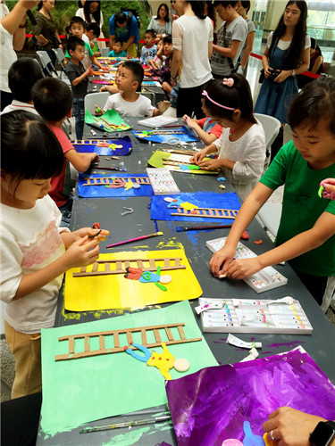 本期“玩美主义·儿童工坊——快乐粉刷匠”活动正逢中秋节前夕,我们特别邀请到新美美术教育的梁杰老师带领孩子们使用水粉颜料、超轻粘土以及瓦楞纸等多种材料进行创意绘画。看,孩子们爬上亲手搭建的小梯子去天上赏月咯~