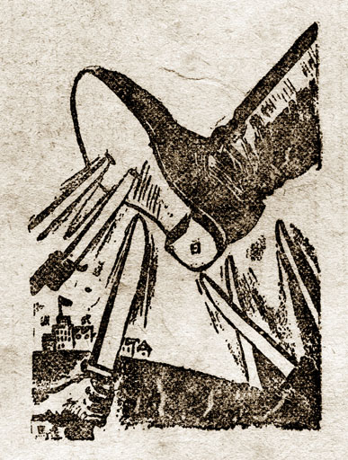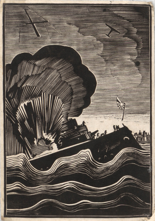 《轰炸出云舰》,马达 作,木刻,19×13.3cm(《抗战漫画》第1期)