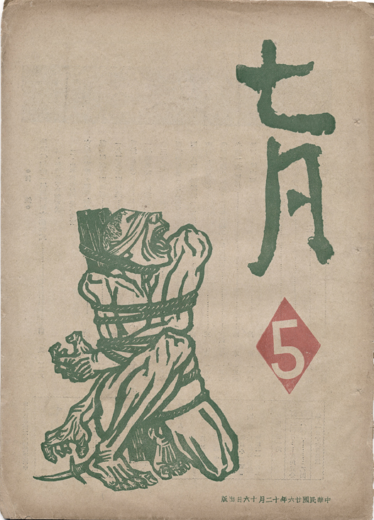 《被枷锁着的中国怒吼了》,李桦 作,《七月》第5期封面1937年汉口出版