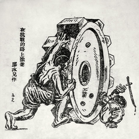 《在抗战的路上推进》,廖冰兄 作(《新华日报》1938年5月1日刊头画)