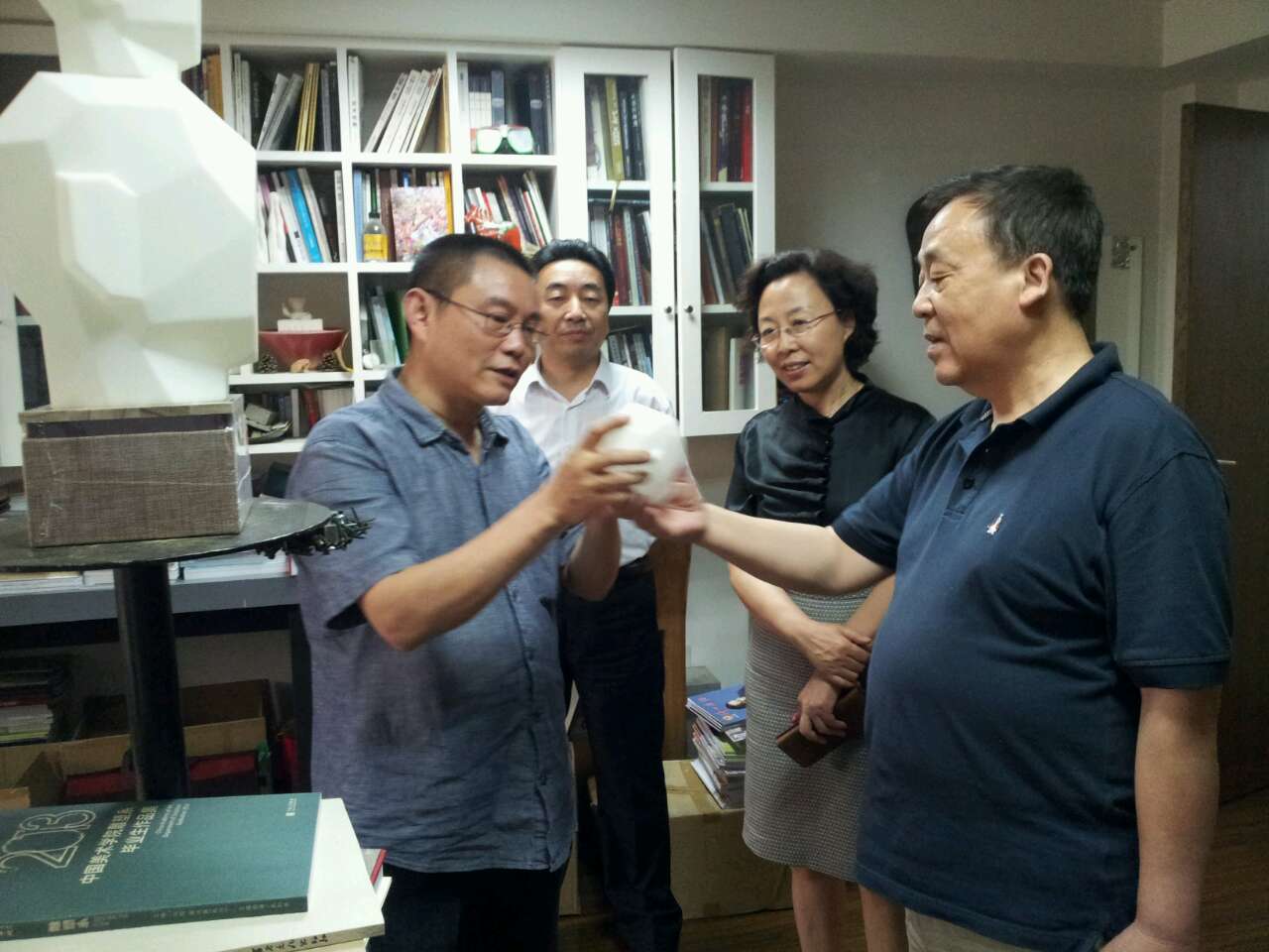 湖北美术馆馆长傅中望向两位厅长展示雕塑作品