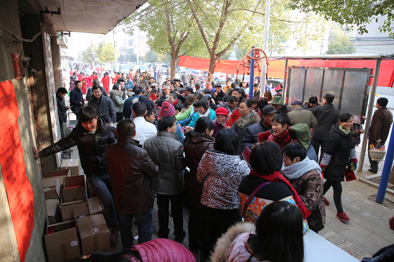 当地居民排队领取春联和书籍