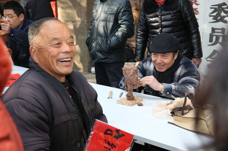 接着,湖北美术馆组织书法家、雕塑家、油画家,现场为大家写春联、塑泥像、画肖像。大家都兴致勃勃,看着艺术家们进行艺术创作啧啧称奇。“像,太像了!”“书法家就是书法家,写的字就是好!”“艺术家写的‘福’字挂在家里,今年肯定鸿运当头!”人群中不时发出这样的赞叹。由于村民的热情高涨,活动结束时间也一推再推。充满喜庆和美好祝福的春联,栩栩如生的画像和雕塑,让村民们爱不释手,大家都喜笑颜开,纷纷表示湖北美术馆这是“把浓浓的年味儿和新春的祝福送到了大家的心坎上”,希望这种活动能长期开展下去,并能经常送文化下乡。不少未来得及赶上的居民一再追问下次活动的时间,表示这次很遗憾,下次一定早早来排队。