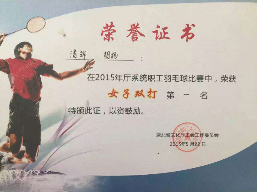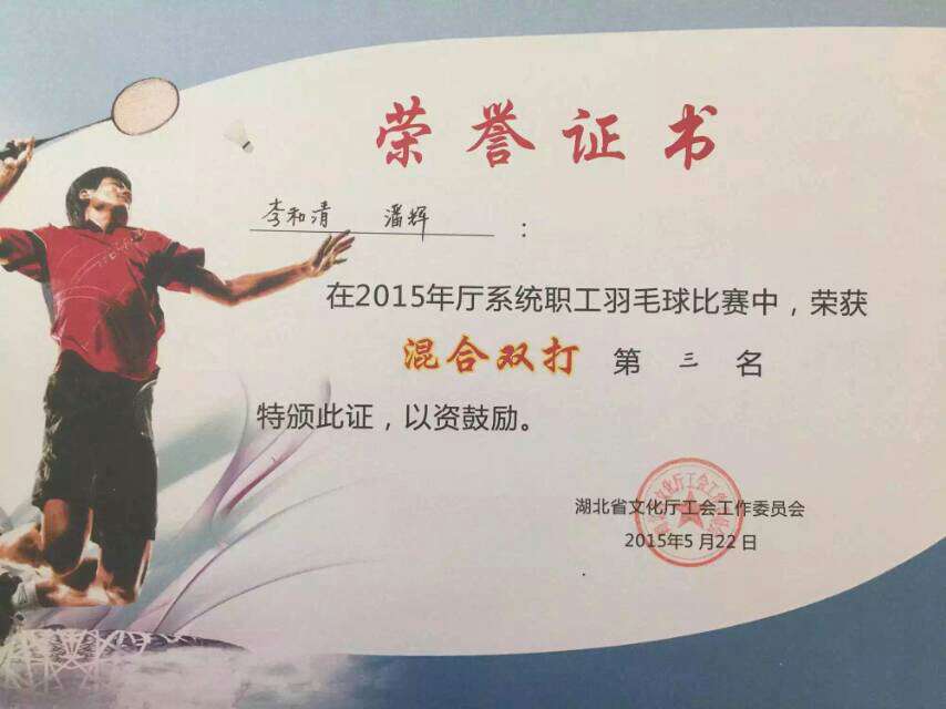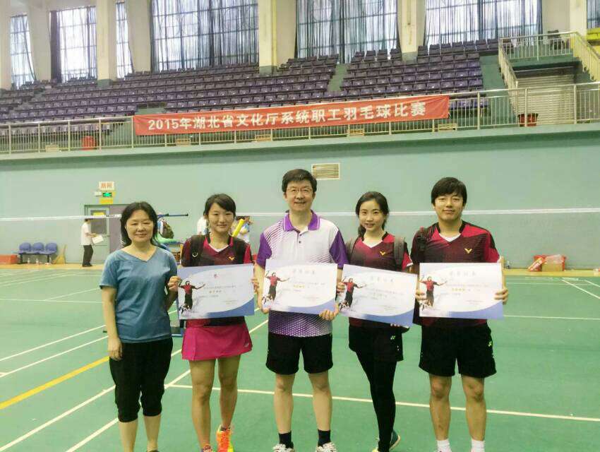 5月22日,2015年湖北省文化厅系统羽毛球赛在武汉大学中南医院体育馆圆满落幕。湖北美术馆四名参赛选手尽心尽力,奋力拼搏,取得女子双打第一名,混合双打第三名的好成绩,充分展现了湖北美术馆的活力和风采!四名参赛选手三人获奖,湖北美术馆成为厅直单位参赛选手少,获奖率最高的参赛队伍。