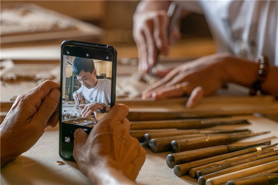 活色生香的大冶刺绣、萌趣可爱的大冶木雕、色彩斑斓的阳新布贴、纤巧秀丽的雕花剪纸、奇异瑰丽的楚式漆器、寓意祥瑞的红安绣活、古朴雅趣的通山木雕、形象逼真的武汉面塑、精美绝伦的潜江竹编,来自荆楚大地的非遗代表性项目成为会场上一道靓丽的风景。这是本次培训班的短视频拍摄现场,传承人现场展示绝技绝活,学员们分组进行拍摄。
