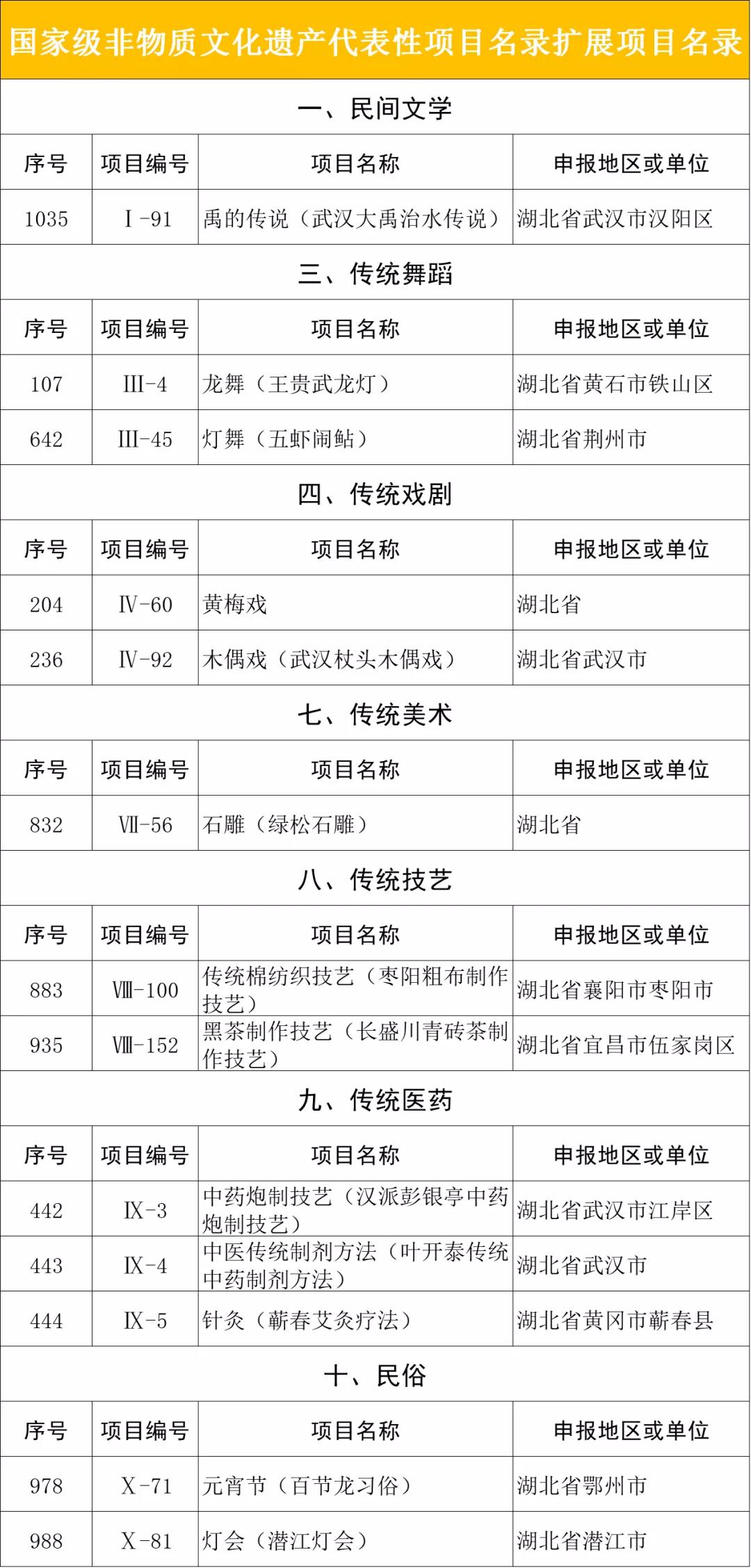 6月10日,国务院公布了第五批国家级非物质文化遗产代表性项目名录,湖北省18个项目入选!其中,新增项目5项,扩展项目13项,涵盖民间文学、传统舞蹈、传统戏剧、曲艺、传统美术、传统技艺、传统医药、民俗八大类别,入选率在全国居于前列。